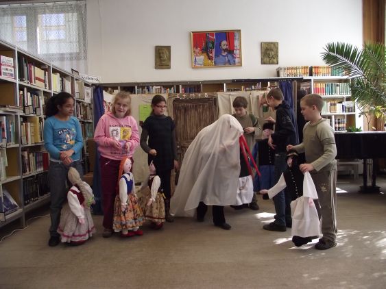 Urbánné Lantos Éva és Urbán István bábművészek vezetésével inretaktív zenés bábjátékkal búcsúztatták a gyerekek a farsangot 2011. március 10-én 10 órakor könyvtárunk Olvasótermében.